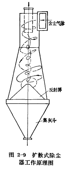 擴(kuò)散式旋風(fēng)除塵器是一種高效率捕集顆粒狀粉塵的除塵器,其原理如圖所示。實(shí)際上是一般旋風(fēng)除塵器的改進(jìn),因此其基本原理與旋風(fēng)除塵器相似。一般旋風(fēng)除塵器內(nèi)的外旋流到達(dá)頂后產(chǎn)生返回上升的內(nèi)旋流。由于旋渦作用,能夠把一部分已經(jīng)分離落下的粉塵重新卷起,被內(nèi)旋流夾帶出去。這個(gè)作用對(duì)于旋風(fēng)除塵器的效率降低影響很大,特別對(duì)于細(xì)顆粒粉塵更為顯著,因?yàn)榧?xì)顆粒容易卷起。為了克服這個(gè)缺點(diǎn),將圓錐體改為擴(kuò)散式倒圓錐,便構(gòu)成了擴(kuò)散式旋風(fēng)除塵器。擴(kuò)散式倒圓錐的結(jié)構(gòu),可減少四周含塵氣體自筒體中部短路流向中心排風(fēng)管的可能。另外在底部裝有圓錐形反射屏,塵??裳赝脖诜瓷淦灵g的環(huán)隙向下沉降進(jìn)入集塵斗。大部分氣體沿著反射屏流向中心部分形成內(nèi)旋流,少量氣體隨粉塵進(jìn)入集塵斗,經(jīng)反射屏頂部小孔返回內(nèi)旋流,因此防止了內(nèi)旋流卷吸已分離落下的粉塵,有效地減少了內(nèi)旋流夾帶的粉塵,提高了除塵效率。