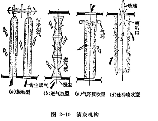 清灰機(jī)構(gòu)如圖(a)振打型、(b)逆流反吹型-(c)氣環(huán)反吹型和(d)脈沖噴吹型。振打型是利用機(jī)械振動(dòng)濾袋,將除塵布袋上的粉塵振打下來。逆流反吹型是利用與含塵氣流反方向流動(dòng)的氣流將濾袋上的粉塵吹落下來。氣環(huán)反吹型是利用具有噴射壓縮空氣隙縫的氣環(huán),沿圓筒形濾袋外側(cè)上下移動(dòng),把濾袋上的粉塵吹落下來。脈沖噴吹型是利用脈沖控制儀每隔30-60秒將壓縮空氣從噴嘴經(jīng)過喇叭口噴入濾袋一次(每次噴吹 0.1秒)。含塵氣流是由濾袋四周進(jìn)入濾袋中,經(jīng)濾袋過濾后的氣體從濾袋內(nèi)通過喇叭口排出。清灰時(shí),壓縮空氣突然噴人使連袋受到向外撐的振動(dòng)力及向外的噴射氣流,把濾袋_L的粉塵振吹下來。