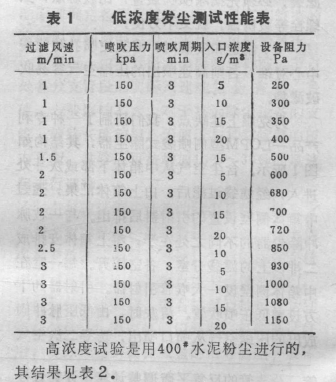 表中工況1的發(fā)塵濃度為188g/m3,過(guò)濾速度為2m/min,噴吹壓力為150kPa,脈沖間隔為20秒。這時(shí)除塵器阻力保持在700Pa左右。