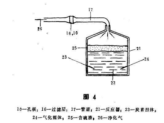 在圖4中表示了備有金屬鍋融浴的煤氣化反應器21,如鐵熔融礦物,在熔爐表面下方的炭素擔體23,微粒碳及氧化性氣化媒體24,在熔融浴表面上保持著含硫渣25,由沒有硫的Co和H2組成的約1300-1450℃的生成氣通過管道吸收凈化了的生成氣26,對于后面的冶金還原過程是較合適的.’諸如對發(fā)電用的氣體透平的燃燒。