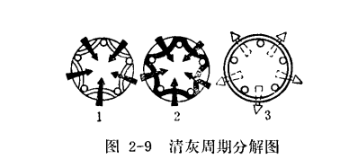 圖2-9為一個(gè)清灰周期的分解圖:1為濾袋過濾初期,濾袋表面吸附的扮塵甚少,2為過濾末期,濾袋表面吸附著一層較厚的粉塵,由千氣流通過濾袋向內(nèi)流動(dòng),濾袋呈多角星狀,3為噴吹清灰狀態(tài),氣流反吹,由里向外,濾袋呈圓形,將濾袋表面吸附的粉塵層吹落。