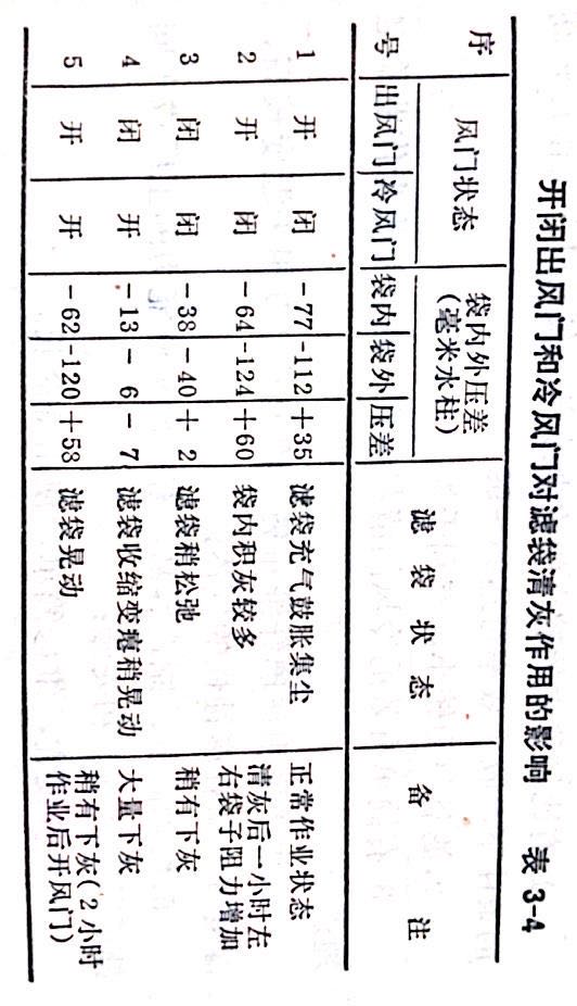 從表3-4可以看出,收塵器在正常工作時,出風(fēng)門是開的,冷風(fēng)門是閉的,此時袋內(nèi)壓力總是大于袋外壓力,濾袋在充氣張開狀態(tài)下收塵。當(dāng)出風(fēng)門與冷風(fēng)門都關(guān)閉時,袋內(nèi)外壓力基本處于平衡,袋內(nèi)部分附灰靠自重墮落,但緊靠在袋壁的附灰仍附著在濾袋內(nèi)。當(dāng)出風(fēng)門和冷風(fēng)門都打開時,因冷風(fēng)竄入過濾室,而發(fā)生濾袋晃動,使袋內(nèi)附灰振落一部分,但仍有部分附灰附著在濾袋內(nèi)。唯有當(dāng)出風(fēng)門關(guān)閉,冷風(fēng)門打開時,袋外壓力大于袋內(nèi)壓力袋子收縮變癟,才使附著袋內(nèi)的全部灰層脫落到集塵斗中去。