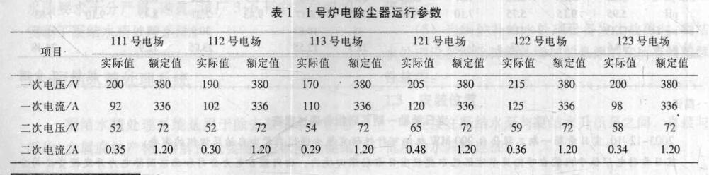 1號爐除塵器運行參數(shù)見表1。從表1可知:1號爐除塵器運行參數(shù)的實際值與額定值相差甚遠,二次電流的平均合格率僅為16.7%(二次電流合格率為額定電流的40%,即0.48 A )。由此可見除塵器的除塵效率遠遠達不到設(shè)計要求。