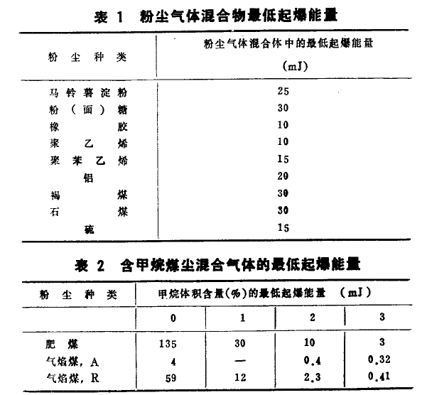 為了解決粉塵爆炸問題,必須確定起爆源能里的最低值.表I歸納了幾個最小起爆能量的例證,是從各種塵、氣混合物中測得的.