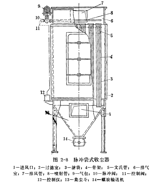 脈沖袋式收塵器是由脈沖噴吹機(jī)構(gòu)—脈沖閥及控制閥、濾袋、排氣室、過濾室、集塵斗、進(jìn)風(fēng)管、排氣管、螺旋輸送機(jī)等主要部分所組成。它的構(gòu)造如圖2-8,